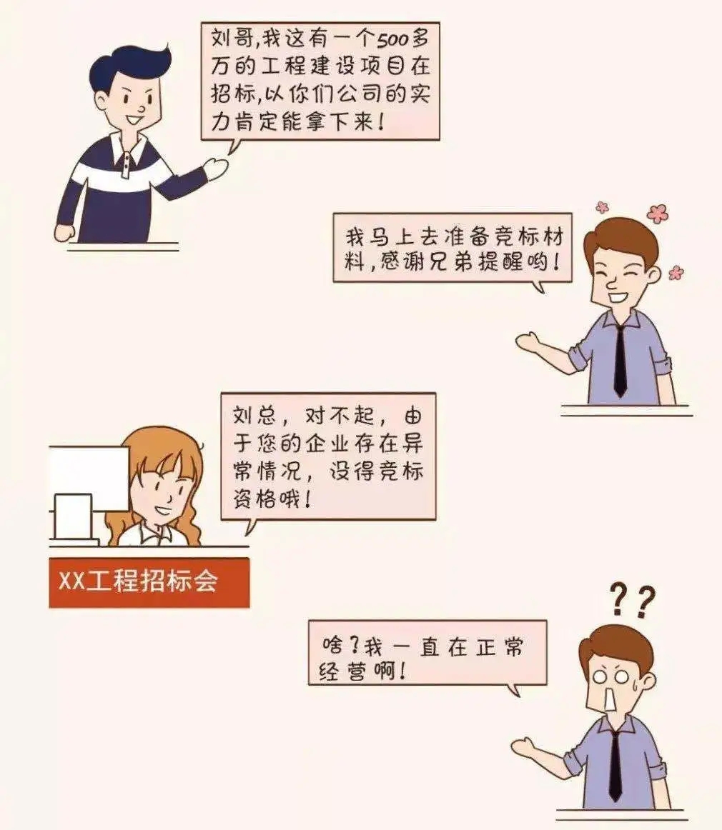 僅剩 7天 02企業合作信用受疑 現在是信用社會,信用對于人和企業來說都至關重要,大家都喜歡和有信用的人交往、合作。 被列入經營異常名錄,你看看誰還找你合作! 03經營活動受限 經營異常名錄信息現在也是 銀行等金融機構貸款、擔保等金融活動的 參考依據 老板 你好,我去年年報忘記報,現在被列入經營異常名錄,本來想著在阿里巴巴注冊一個網店,在網上做點小生意,結果被告知因為企業是經營異常名錄,注冊不了,這可怎么辦呀! 你好,首先應在國家企業信用信息公示系統補報年報,然后再準備好相關材料去當地市場監管部門申請移出哦。 小編 老板 好的,萬萬沒想到沒報年報的后果竟然這么嚴重,嚴重影響了我的經營活動,我真是后悔莫及。 是的,企業被列入經營異常名錄,那就有了信用污點,必須高度重視哦!對了,2019年度的年報馬上也要截止啦,請及時申報哦。 小編 老板 2019年度的年報我們公司馬上準備申報了,經過這次,以后一定不會忘了及時年報! 建議您盡早進行年報,避免因月底網站擁堵或企業自身數據方面準備不充分造成年報延遲。 小編 04列入嚴重違法企業名單 最最最嚴重的后果來啦! 列入經營異常名錄三年還沒有履行信息公示義務的企業,將被列入嚴重違法失信企業名單 企業五年內不能申請移出嚴重違法失信名單,法定代表人、負責人也將受到牽連,三年內不得擔任其他企業的法定代表人、負責人! 企業一站式服務平臺 工商注冊、財稅代賬、審計評估、稅務籌劃、商標專利、資質審批、人才獵頭、人才報名、金融保險、信用評級、法務咨詢、項目申報 公司網站:m.poconobiz.com 聯系方式:400-0551-976 合肥總部:安徽省合肥市南一環與馬鞍山路交口恒興廣場A座24樓 分部:合肥市行政服務中心一樓“萬業公司代理窗口”(工商局窗口正對面) 分部:合肥市瑤海區行政服務中心一樓“萬業公司代理窗口”(工商局窗口正對面)