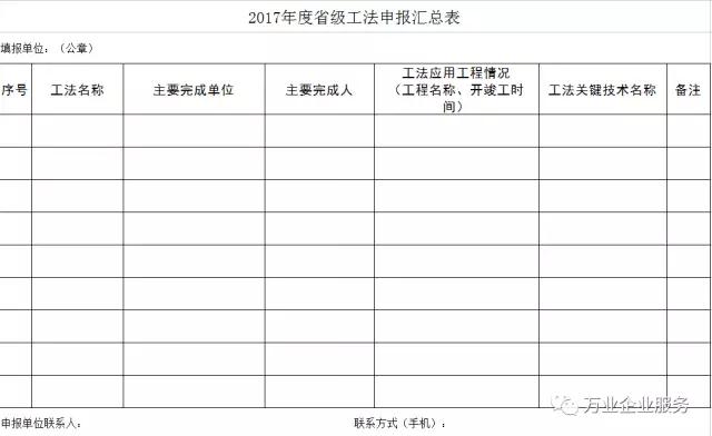 (七)2017年度省級(jí)工法申報(bào)匯總表,其電子版連同工法文本電子文檔發(fā)至郵箱751713940@qq.com。