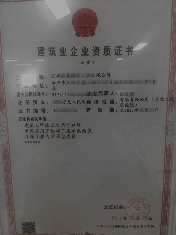 級別:建筑工程總包三級+環保工程三級+市政三級