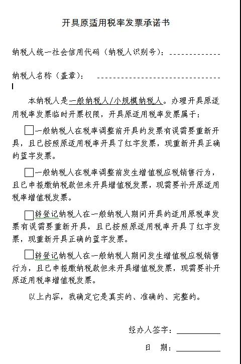 2.自2019年9月20日起,納稅人需要通過增值稅發票管理系統開具17%、16%、11%、10%稅率藍字發票的,應向主管稅務機關提交《開具原適用稅率發票承諾書》(附件2〕,辦理臨時開票權限。