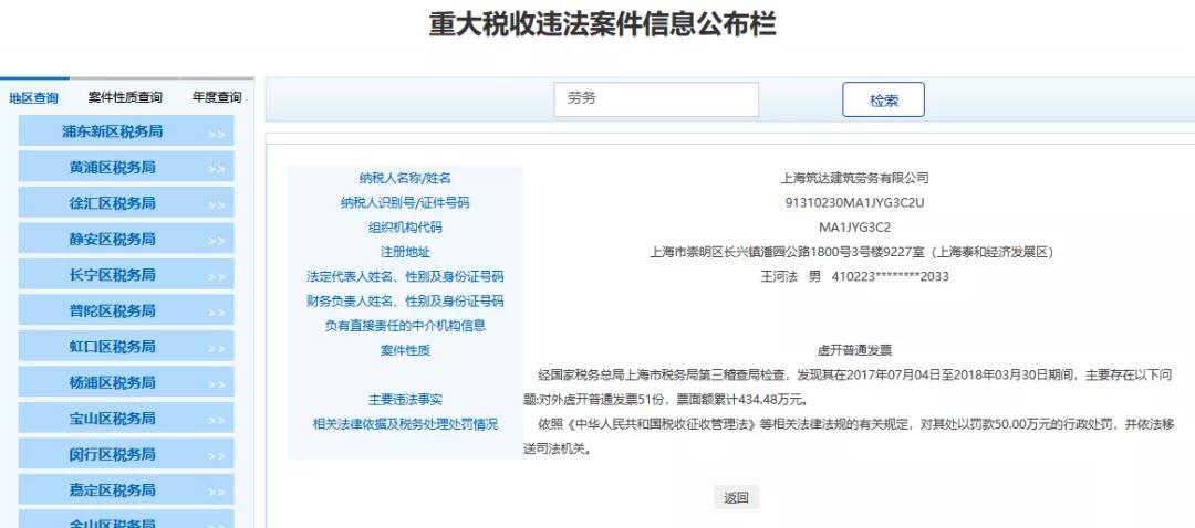 2、上海XX建筑勞務(wù)有限公司,經(jīng)國家稅務(wù)總局上海市稅務(wù)局第三稽查局檢查,發(fā)現(xiàn)其在2017年07月04日至2018年03月30日期間,主要存在以下問題:對外虛開普通發(fā)票51份,票面額累計(jì)434.48萬元。依照《中華人民共和國稅收征收管理法》等相關(guān)法律法規(guī)的有關(guān)規(guī)定,對其處以罰款50.00萬元的行政處罰,并依法移送司法機(jī)關(guān)。