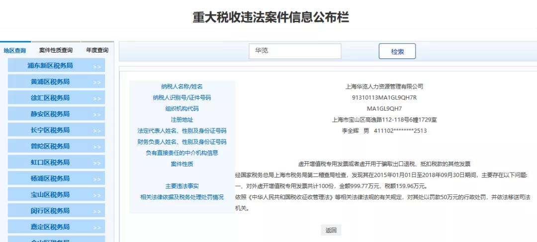1、上海XX勞務(wù)有限公司, 經(jīng)國家稅務(wù)總局上海市稅務(wù)局第三稽查局檢查,發(fā)現(xiàn)其在2016年02月04日至2018年05月02日期間,主要存在以下問題:對外虛開普通發(fā)票1827份,票面額累計(jì)16654.13萬元。依照《中華人民共和國稅收征收管理法》等相關(guān)法律法規(guī)的有關(guān)規(guī)定,對其處以罰款50.00萬元的行政處罰,并依法移送司法機(jī)關(guān)。
